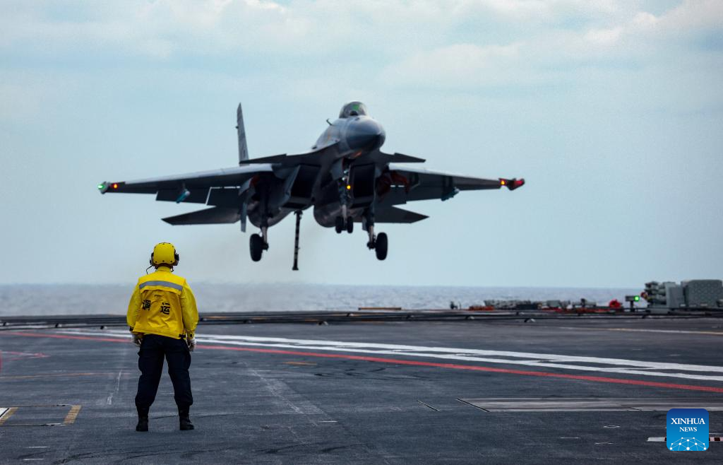This photo shows a fighter jet landing on an aircraft carrier. China's naval formations of two aircraft carriers, Liaoning and Shandong, have completed their far-sea combat-oriented training and safely returned to their home ports, according to the Chinese navy on Monday. (Photo by Wang Yuanlin/Xinhua)