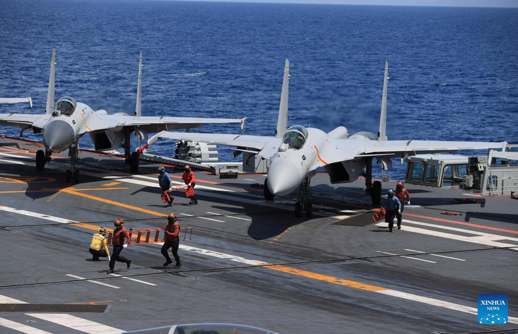 This photo shows fighter jets preparing to take off from an aircraft carrier. China's naval formations of two aircraft carriers, Liaoning and Shandong, have completed their far-sea combat-oriented training and safely returned to their home ports, according to the Chinese navy on Monday. (Photo by Hu Xiushuai/Xinhua)