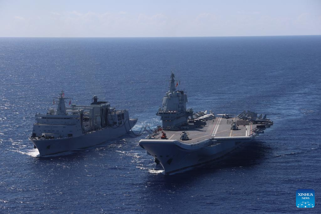 This photo shows the formation conducting replenishment-at-sea. China's naval formations of two aircraft carriers, Liaoning and Shandong, have completed their far-sea combat-oriented training and safely returned to their home ports, according to the Chinese navy on Monday. (Photo by Wang Jian/Xinhua)