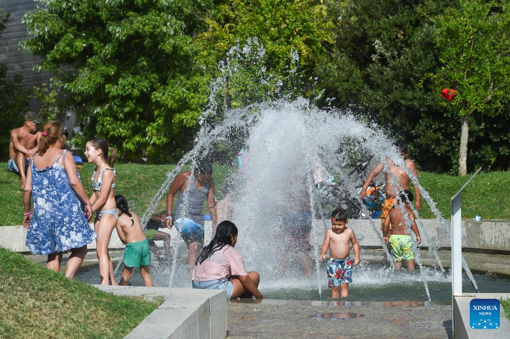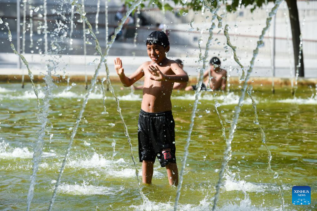 A boy cools off at a fountain in a park in Madrid, Spain, June 29, 2025. Spain has been hit by a new round of heatwave since Saturday, with temperatures in many regions expected to exceed 40 degrees Celsius in the coming days. (Photo by Gustavo Valiente/Xinhua)
