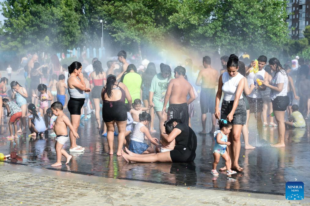 People cool off at a fountain in a park in Madrid, Spain, June 29, 2025. Spain has been hit by a new round of heatwave since Saturday, with temperatures in many regions expected to exceed 40 degrees Celsius in the coming days. (Photo by Gustavo Valiente/Xinhua)