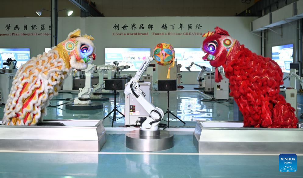 This photo taken on June 29, 2025 shows two industrial robots perform lion dance at Greatoo Intelligent in Jieyang, south China's Guangdong Province.