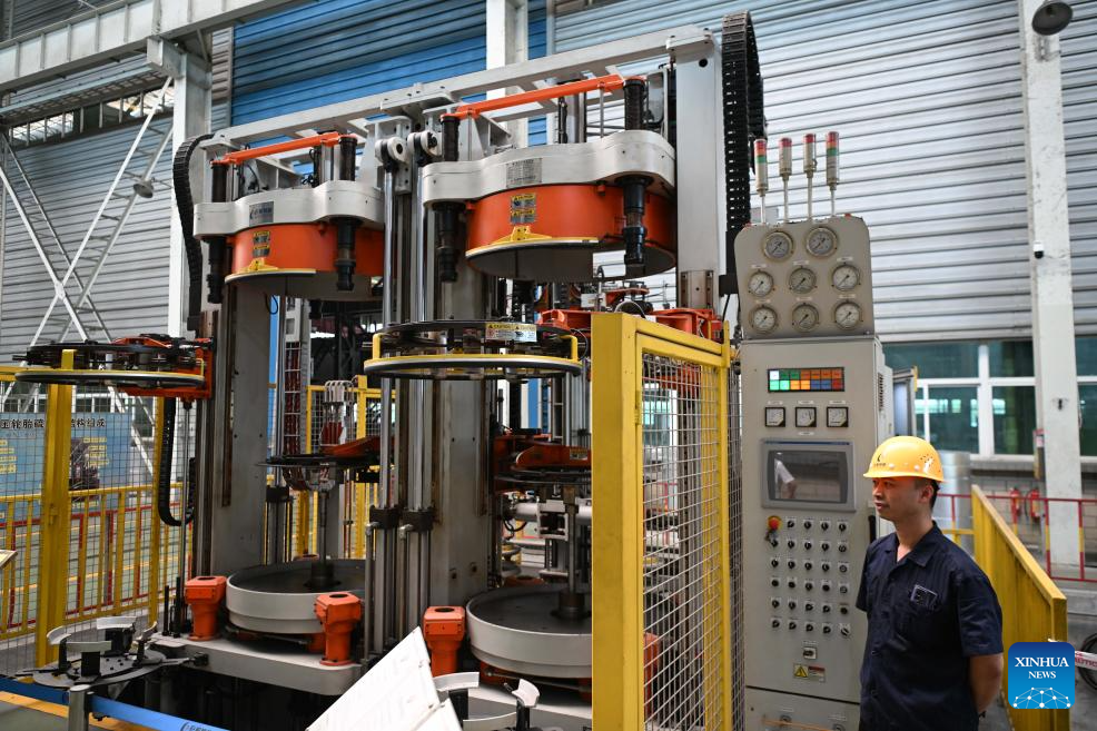 This photo taken on June 29, 2025 shows a hydraulic tire vulcanizing machine at Greatoo Intelligent in Jieyang, south China's Guangdong Province.