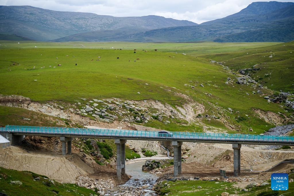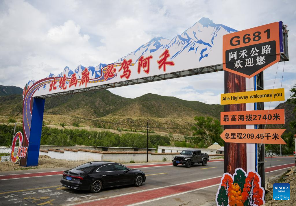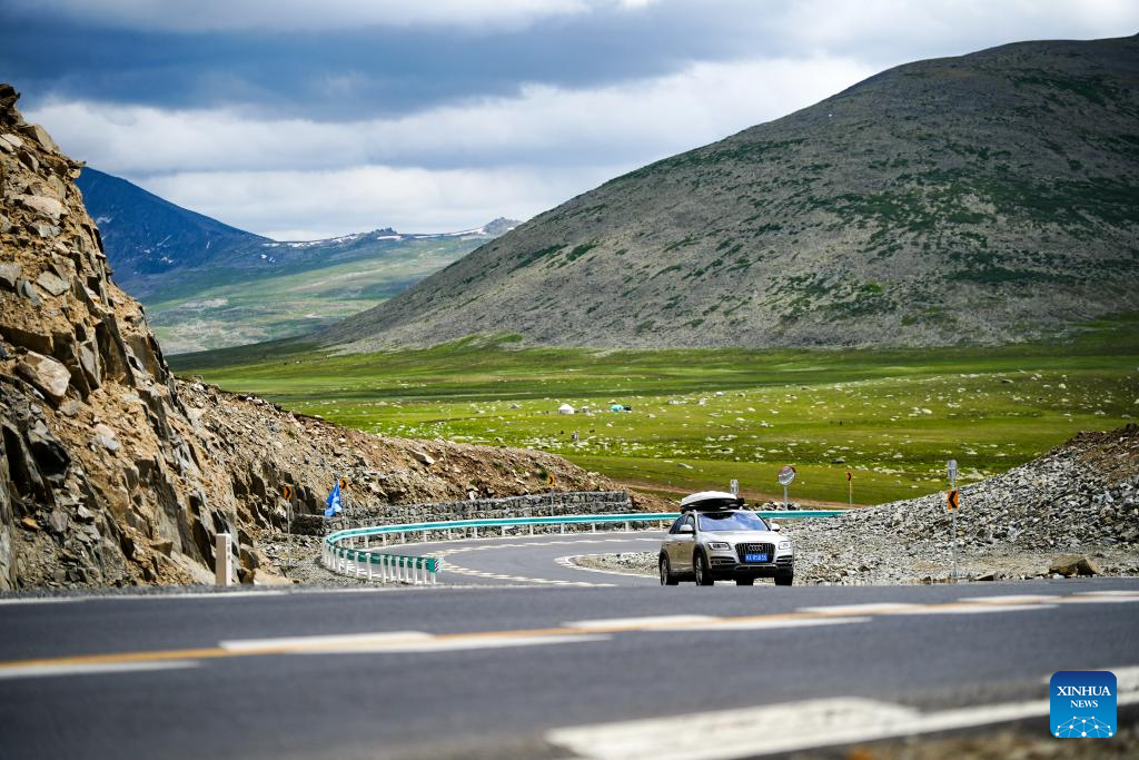 A car runs on the Altay-Hemu highway in northwest China's Xinjiang Uygur Autonomous Region, June 30, 2025. The 209.45-kilometer-long highway linking Altay City and Hemu Village opened officially on Monday, connecting a number of tourist destinations. (Xinhua/Xu Hongyan)