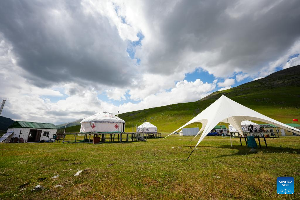 This photo taken on June 30, 2025 shows yurts for catering services run by local villagers alongside the Altay-Hemu highway in northwest China's Xinjiang Uygur Autonomous Region. The 209.45-kilometer-long highway linking Altay City and Hemu Village opened officially on Monday, connecting a number of tourist destinations. (Xinhua/Xu Hongyan)