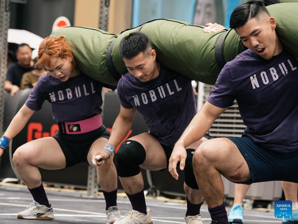 Three competing athletes simultaneously perform a 100kg sandbag thruster in southwest China's Chongqing, June 29, 2025. In recent years, functional fitness training has been steadily gaining momentum in China. Competitions such as CrossFit, HYROX and Spartan are attracting an expanding number of enthusiasts. (Xinhua)