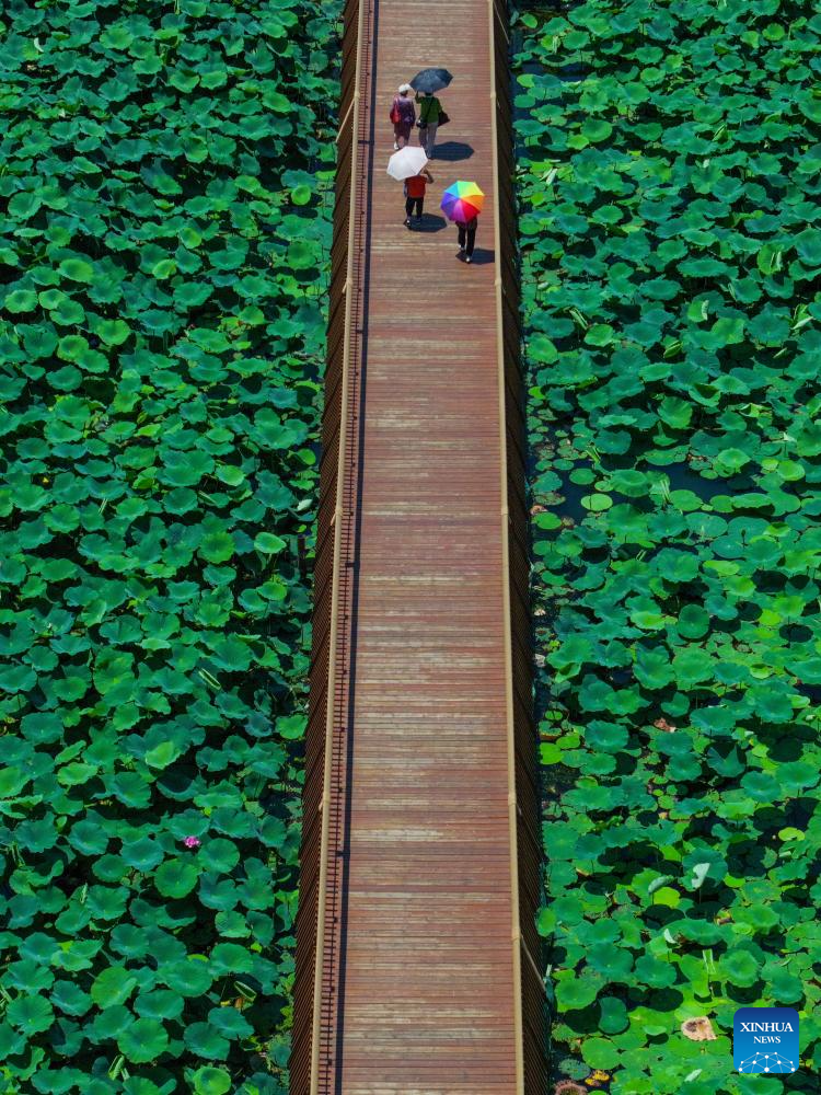 An aerial drone photo taken on July 1, 2025 shows people walking on a plank road to enjoy lotus flowers at the Xuanwu Lake Park in Nanjing, east China's Jiangsu Province. (Xinhua/Li Bo)