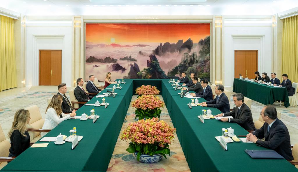 Wang Huning, chairman of the National Committee of the Chinese People's Political Consultative Conference, meets with Marinko Cavara, deputy speaker of the House of Representatives of the Parliamentary Assembly of Bosnia and Herzegovina (BiH), in Beijing, capital of China, July 1, 2025. (Xinhua/Zhai Jianlan)