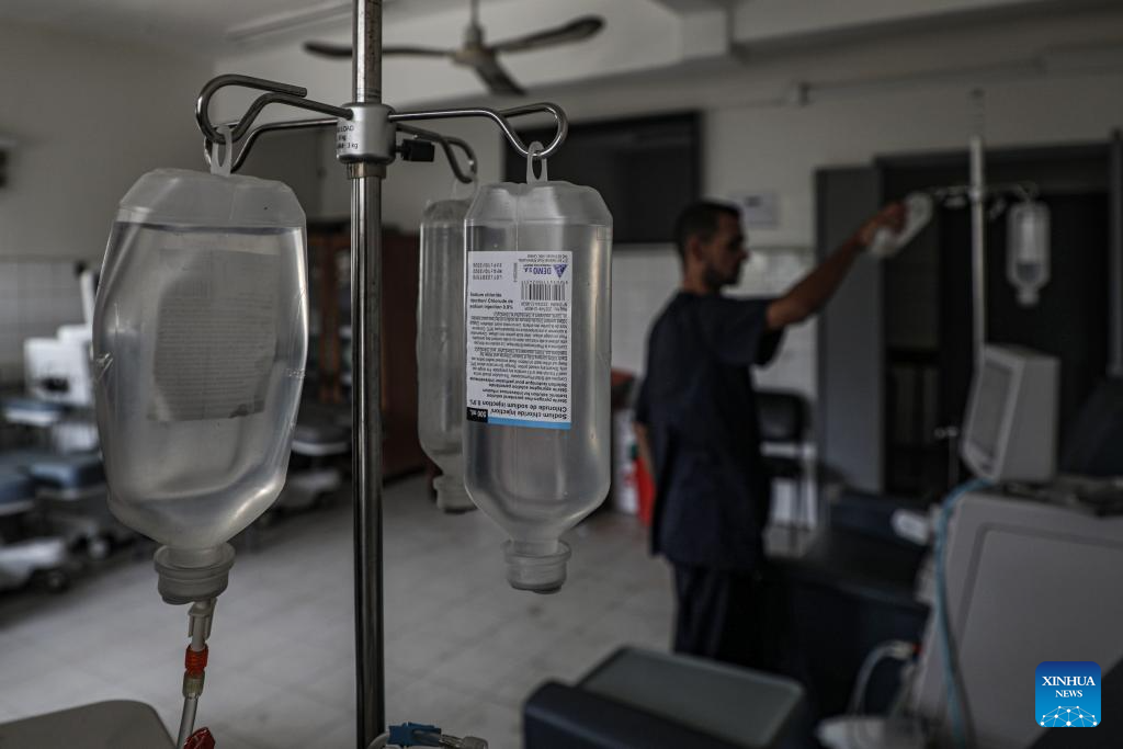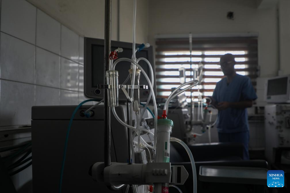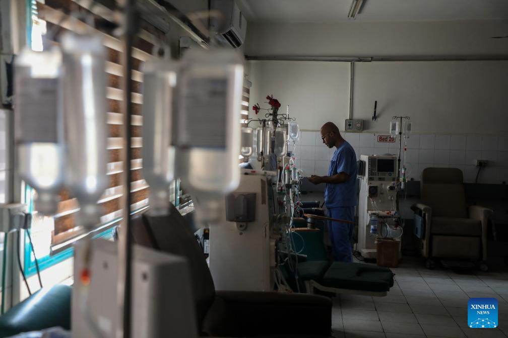 A medical worker is seen at the dialysis department of al-Shifa Hospital in Gaza City, on July 1, 2025. A suspension of dialysis services at al-Shifa medical complex in Gaza City is threatening the lives of about 350 patients, said the health authorities in the coastal enclave on Tuesday. (Photo by Rizek Abdeljawad/Xinhua)