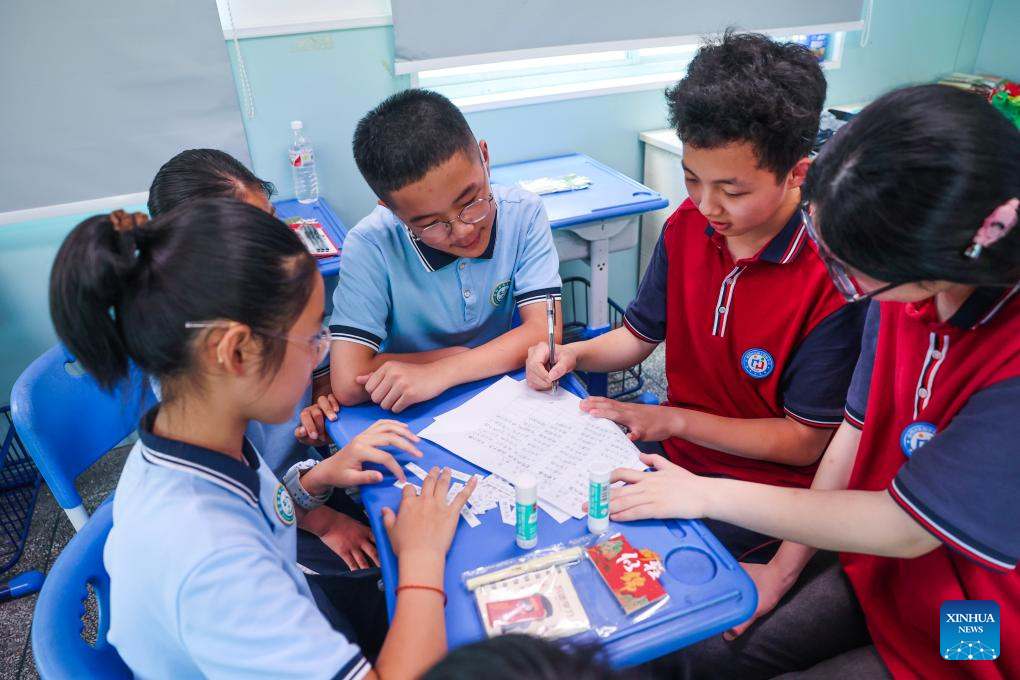 Children play an interactive game at the Donghe Township central school in Donghe Township, Zhuji City of east China's Zhejiang Province, July 1, 2025. Summer camps themed on cultural promotion have been launched here, to enrich summer vocation activities for local students. (Xinhua/Xu Yu)