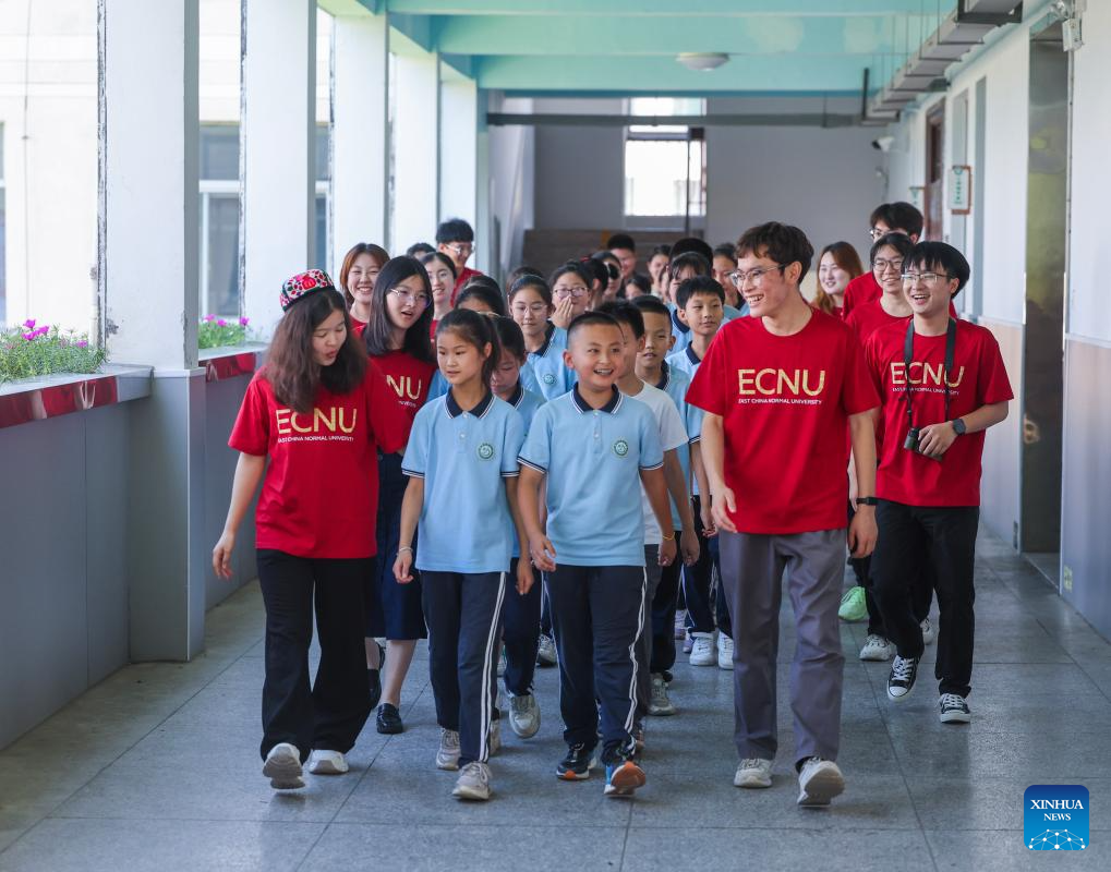 Students from the East China Normal University lead children to classes at the Donghe Township central school in Donghe Township, Zhuji City of east China's Zhejiang Province, July 1, 2025. Summer camps themed on cultural promotion have been launched here, to enrich summer vocation activities for local students. (Xinhua/Xu Yu)