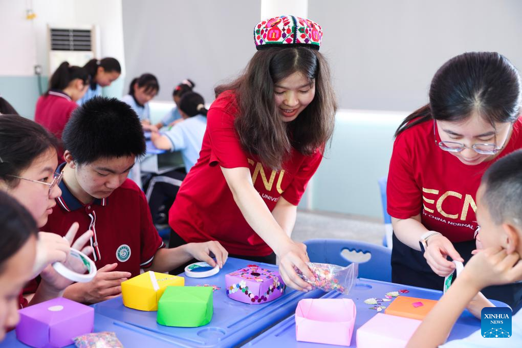 A student from the East China Normal University teaches children to make paper hats at the Donghe Township central school in Donghe Township, Zhuji City of east China's Zhejiang Province, July 1, 2025. Summer camps themed on cultural promotion have been launched here, to enrich summer vocation activities for local students. (Xinhua/Xu Yu)