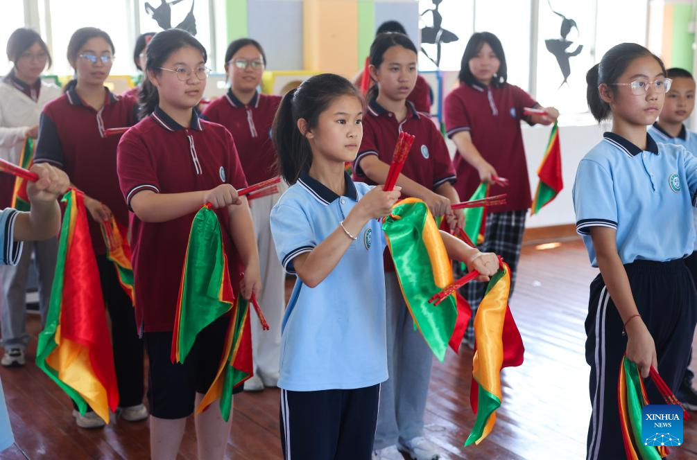 Children learn to dance at the Donghe Township central school in Donghe Township, Zhuji City of east China's Zhejiang Province, July 1, 2025. Summer camps themed on cultural promotion have been launched here, to enrich summer vocation activities for local students. (Xinhua/Xu Yu)