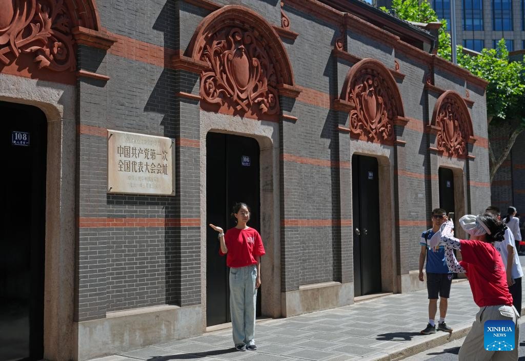 A woman poses for a photo at the site of the first National Congress of the Communist Party of China in Shanghai, east China, July 1, 2025. A series of events celebrating the 104th founding anniversary of the Communist Party of China (CPC) were held at the memorial of the First National Congress of the CPC on Tuesday. (Xinhua/Liu Ying)