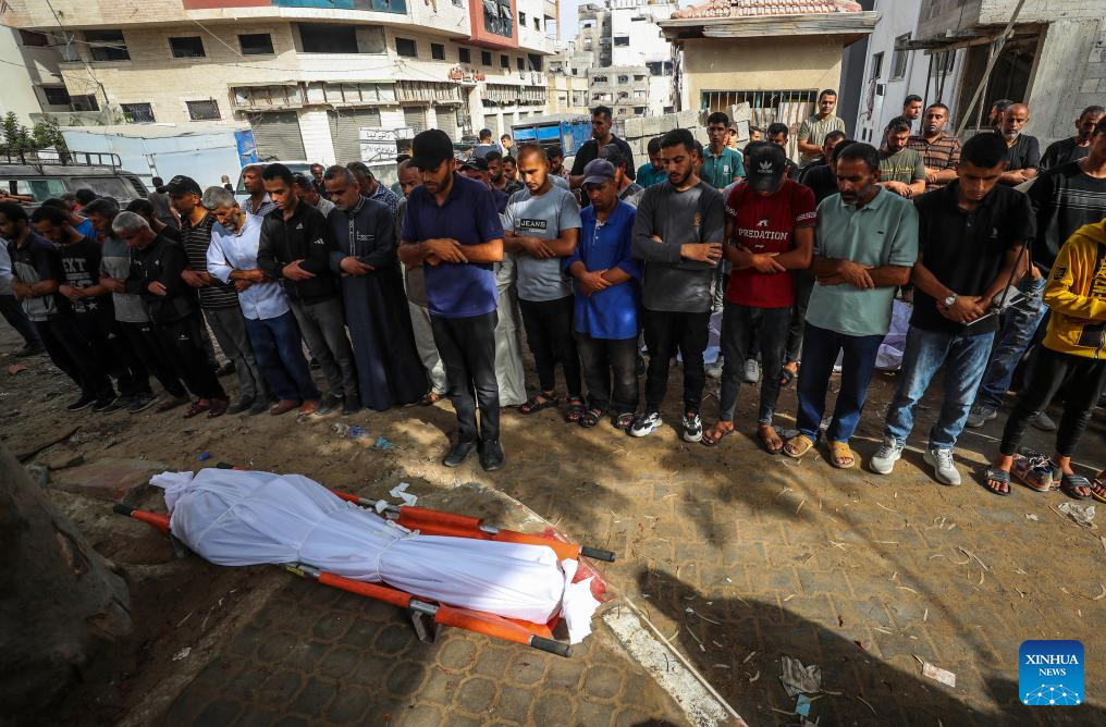 Palestinians pray over victims who were killed in Israeli airstrikes, at a hospital in Gaza City, July 1, 2025. At least 45 Palestinians were killed by Israeli shelling and gunfire in the Gaza Strip on Tuesday, Gaza's Civil Defense said, while the Israeli army announced that it had attacked 140 targets in the coastal enclave over the past 24 hours. (Photo by Mahmoud Zaki/Xinhua)