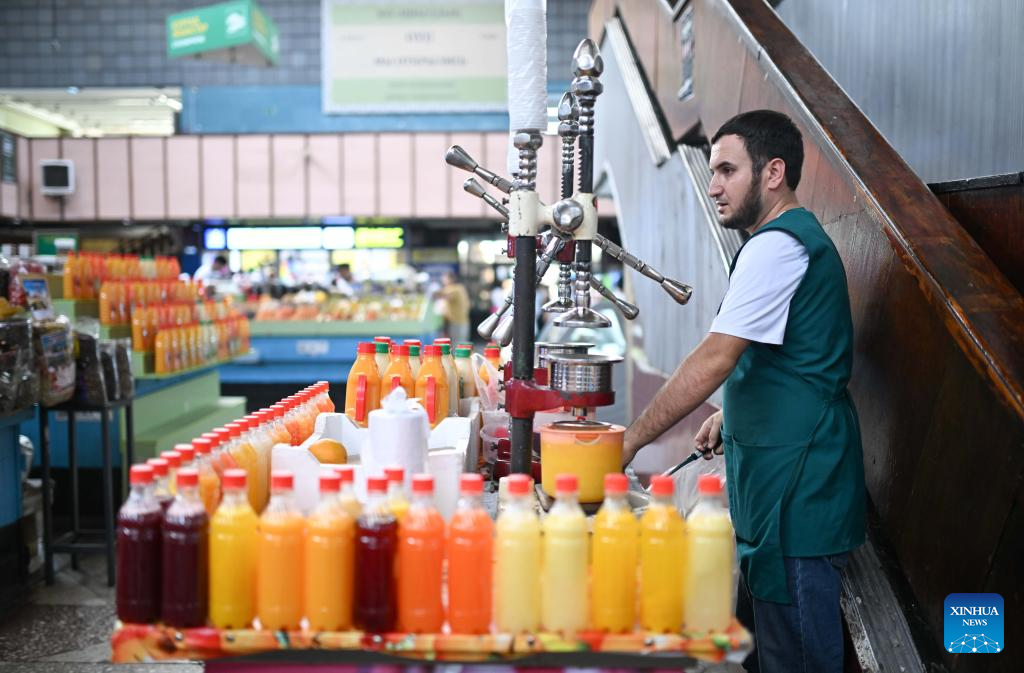 A vendor makes juice in the Green Bazaar in Almaty, Kazakhstan, July 2, 2025. Green Bazaar, one of the most important markets in Almaty, is a well-known marketplace not only in Kazakhstan, but also across Central Asia. (Xinhua/Li Renzi)
