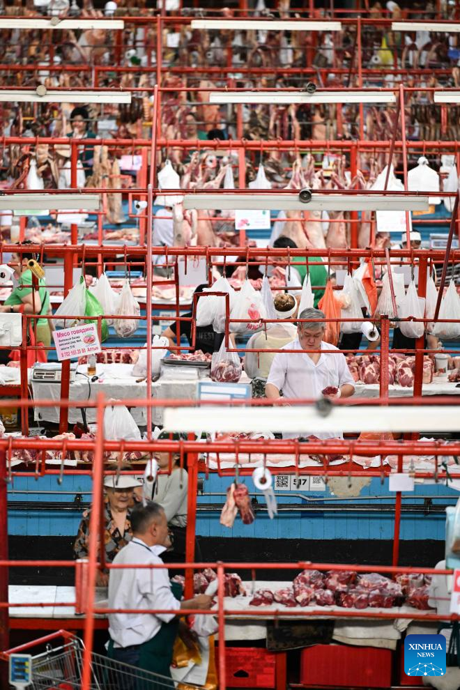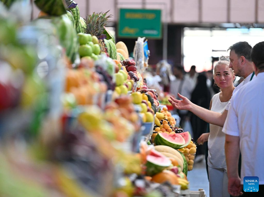 People select goods in the Green Bazaar in Almaty, Kazakhstan on July 2, 2025. Green Bazaar, one of the most important markets in Almaty, is a well-known marketplace not only in Kazakhstan, but also across Central Asia. (Xinhua/Li Renzi)