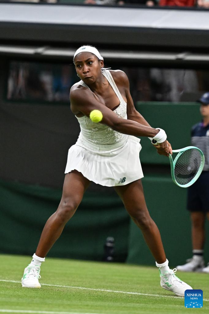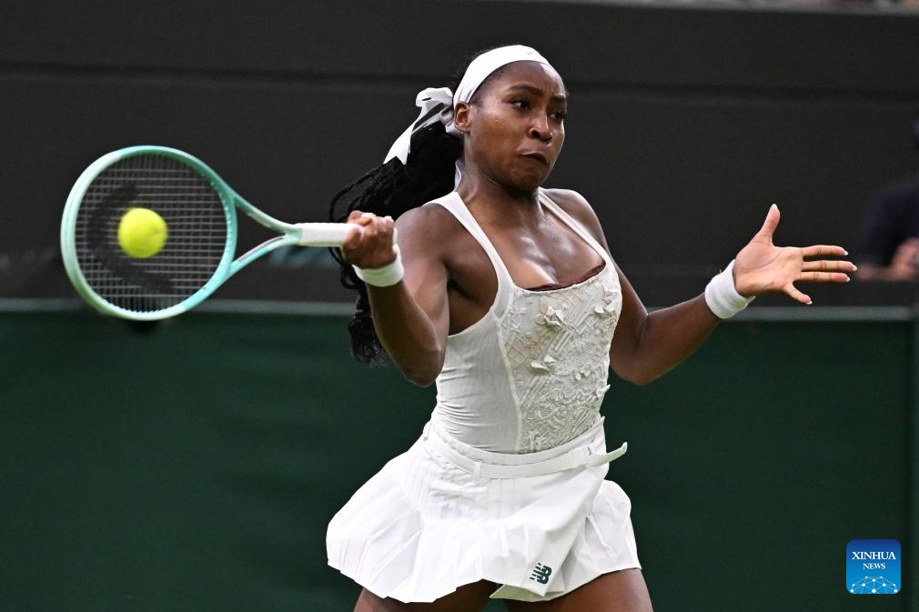 Coco Gauff hits a return during the women's singles first round match between Coco Gauff of the United States and Dayana Yastremska of Ukraine at the Wimbledon Tennis Championships in London, Britain, July 1, 2025. (Xinhua/Zhao Dingzhe)