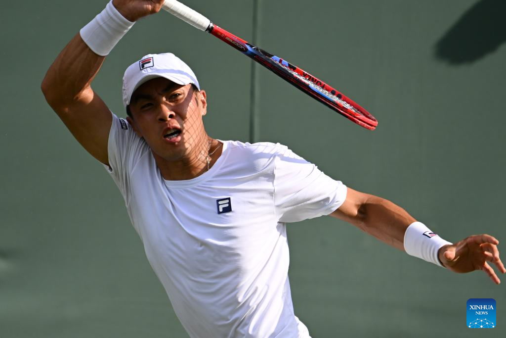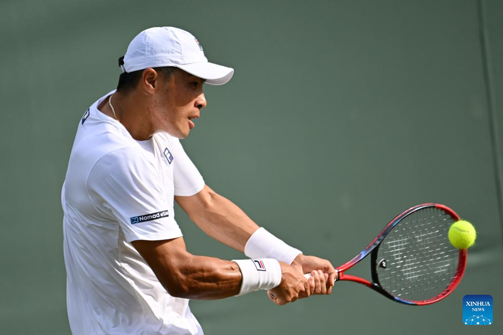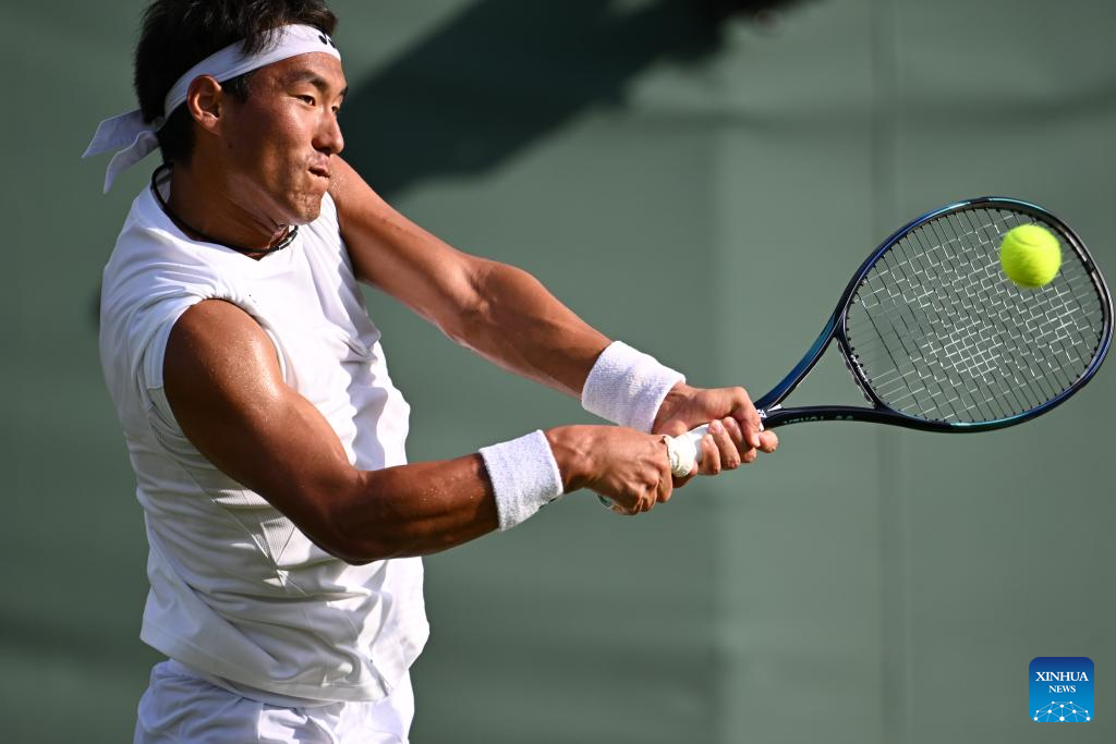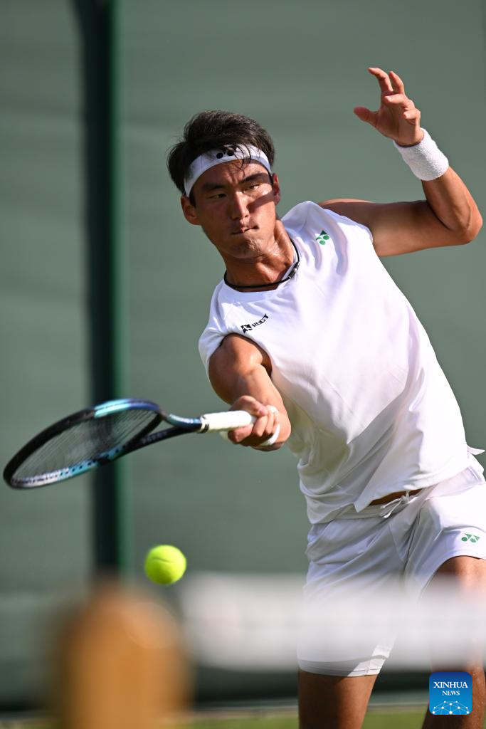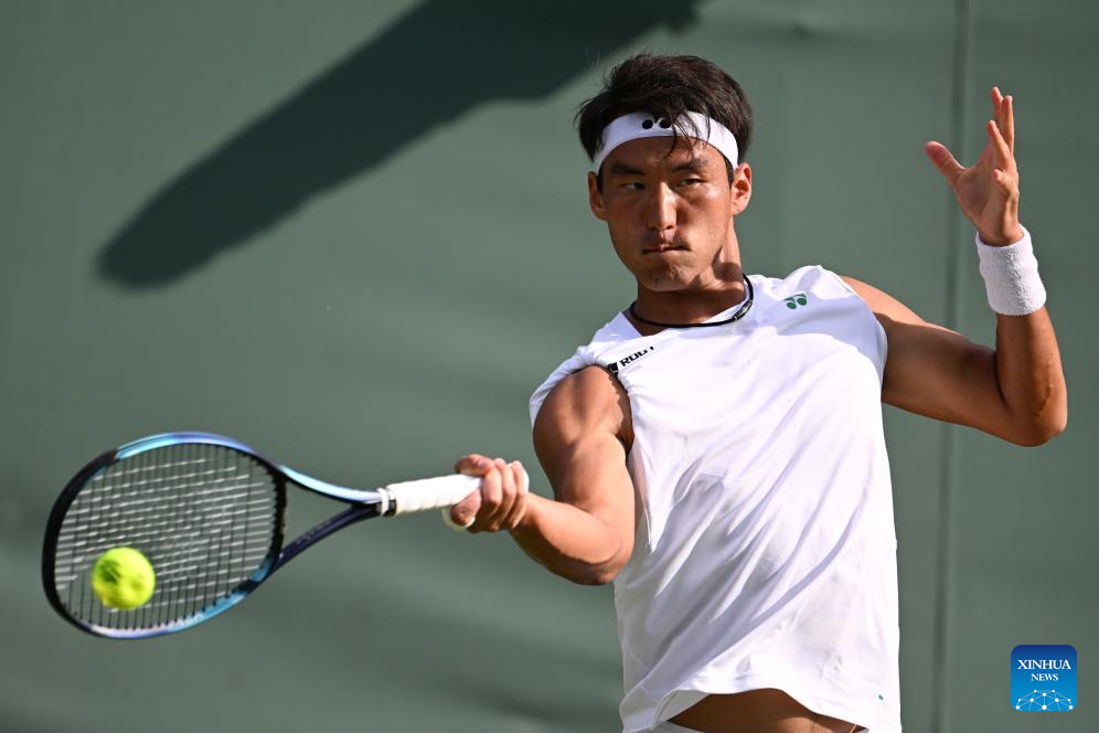 Bu Yunchaokete hits a return during the men's singles first round match between Bu Yunchaokete of China and Nakashima Brandon of the United States at the Wimbledon Tennis Championships in London, Britain, July 1, 2025. (Xinhua/Zhao Dingzhe)