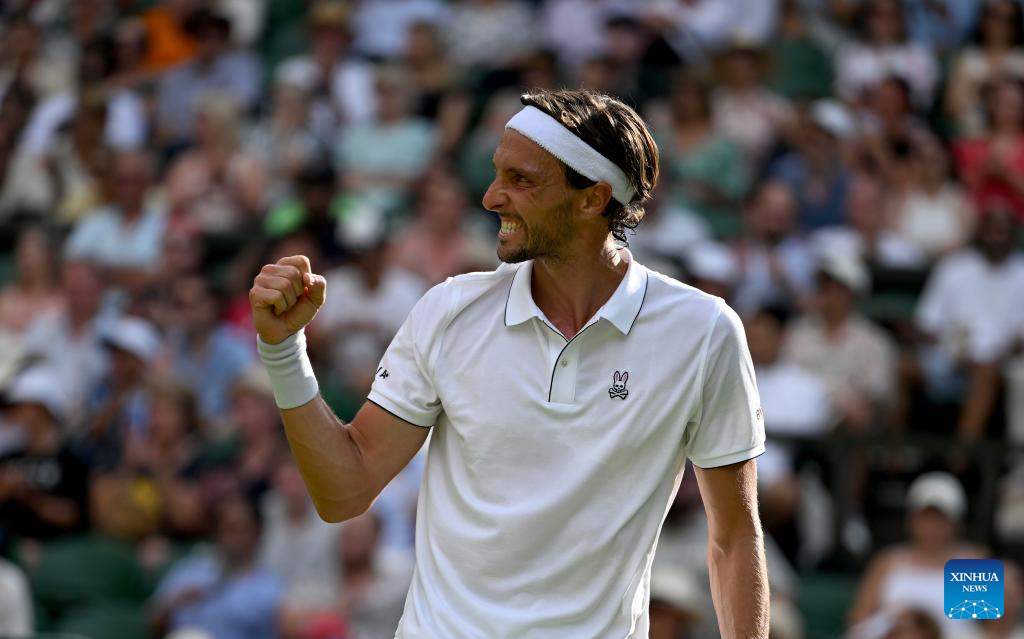 Arthur Rinderknech celebrates scoring during the men's singles first round match between Alexander Zverev of Germany and Arthur Rinderknech of France at the Wimbledon Tennis Championships in London, Britain, July 1, 2025. (Xinhua/Li Ying)