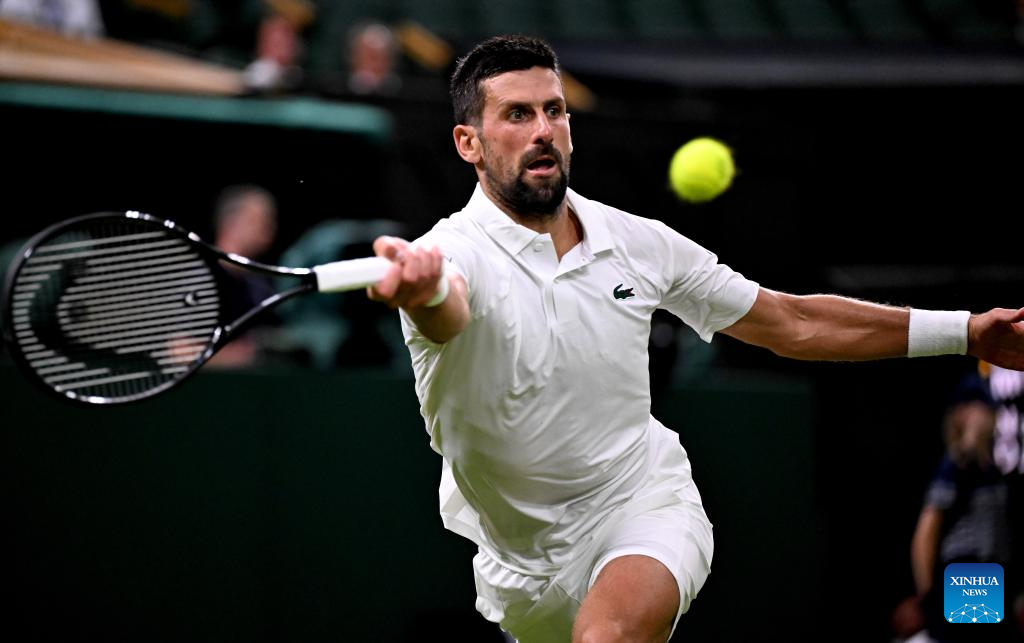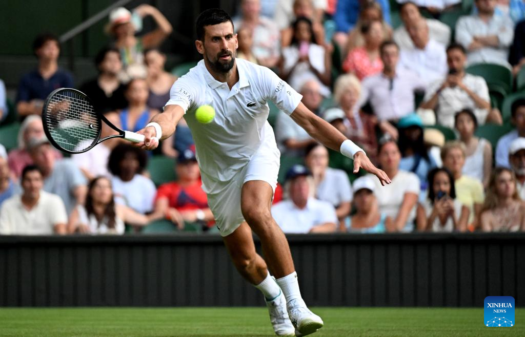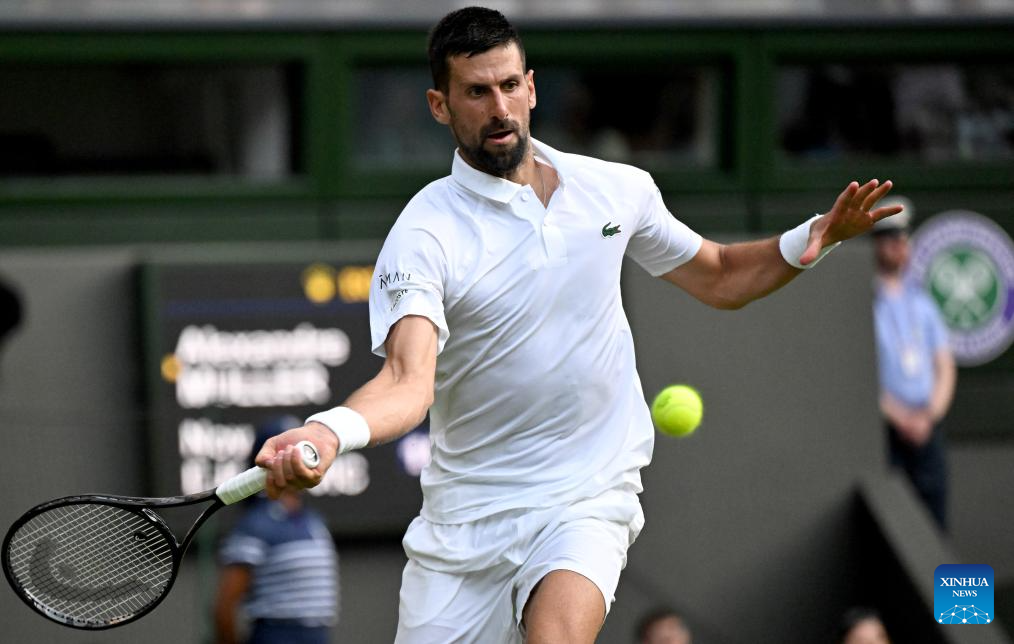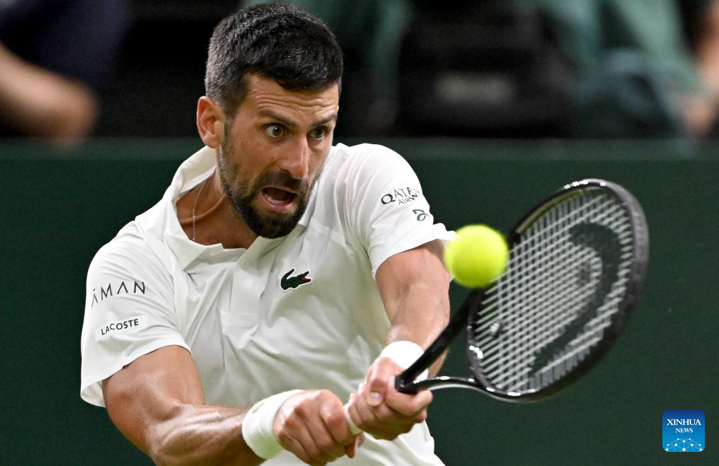 Novak Djokovic hits a return during the men's singles first round match between Novak Djokovic of Serbia and Alexandre Muller of France at the Wimbledon Tennis Championships in London, Britain, July 1, 2025. (Xinhua/Li Ying)
