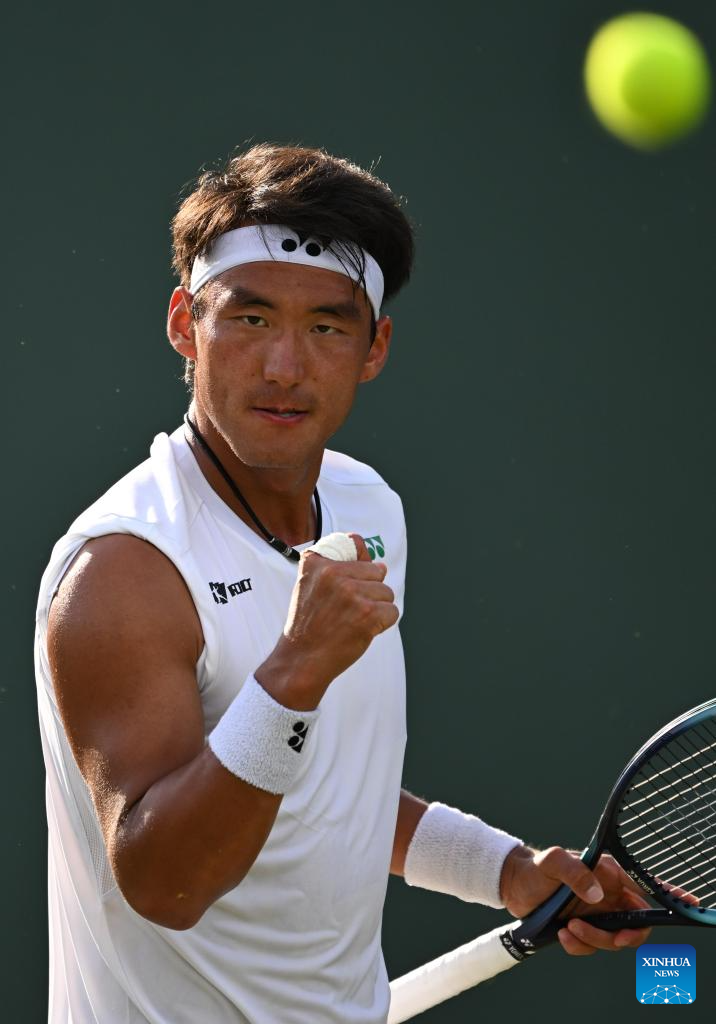 Bu Yunchaokete celebrates scoring during the men's singles first round match between Bu Yunchaokete of China and Nakashima Brandon of the United States at the Wimbledon Tennis Championships in London, Britain, July 1, 2025. (Xinhua/Zhao Dingzhe)
