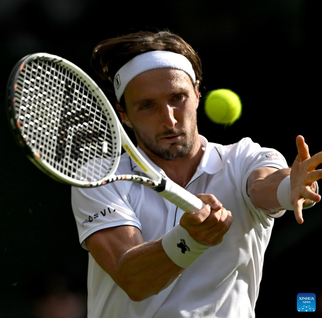 Arthur Rinderknech hits a return during the men's singles first round match between Alexander Zverev of Germany and Arthur Rinderknech of France at the Wimbledon Tennis Championships in London, Britain, July 1, 2025. (Xinhua/Li Ying)
