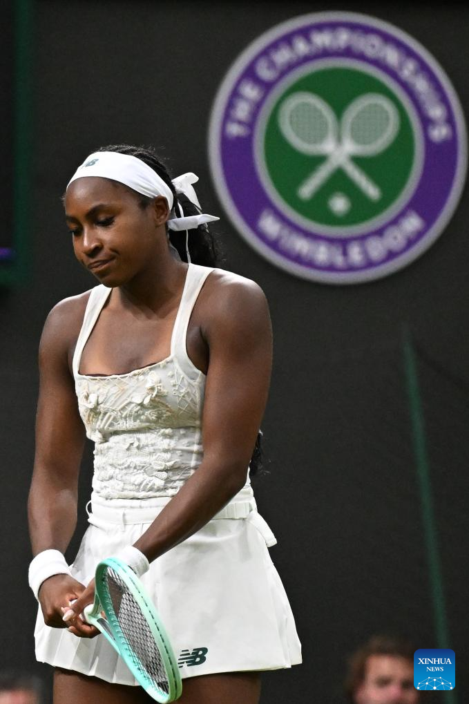 Coco Gauff reacts during the women's singles first round match between Coco Gauff of the United States and Dayana Yastremska of Ukraine at the Wimbledon Tennis Championships in London, Britain, July 1, 2025. (Xinhua/Zhao Dingzhe)