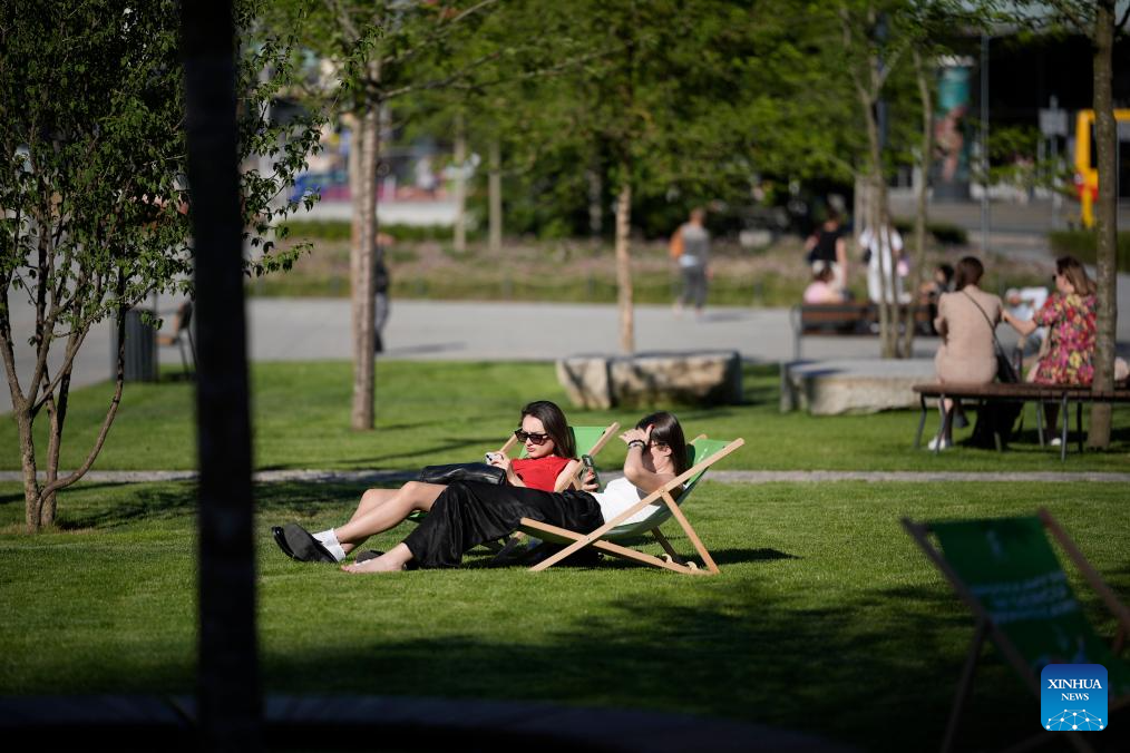 People relax on deck chairs at a green area in downtown Warsaw, Poland, on July 1, 2025. Poland's meteorological authorities have issued heat warnings for much of the country this week. (Photo by Jaap Arriens/Xinhua)