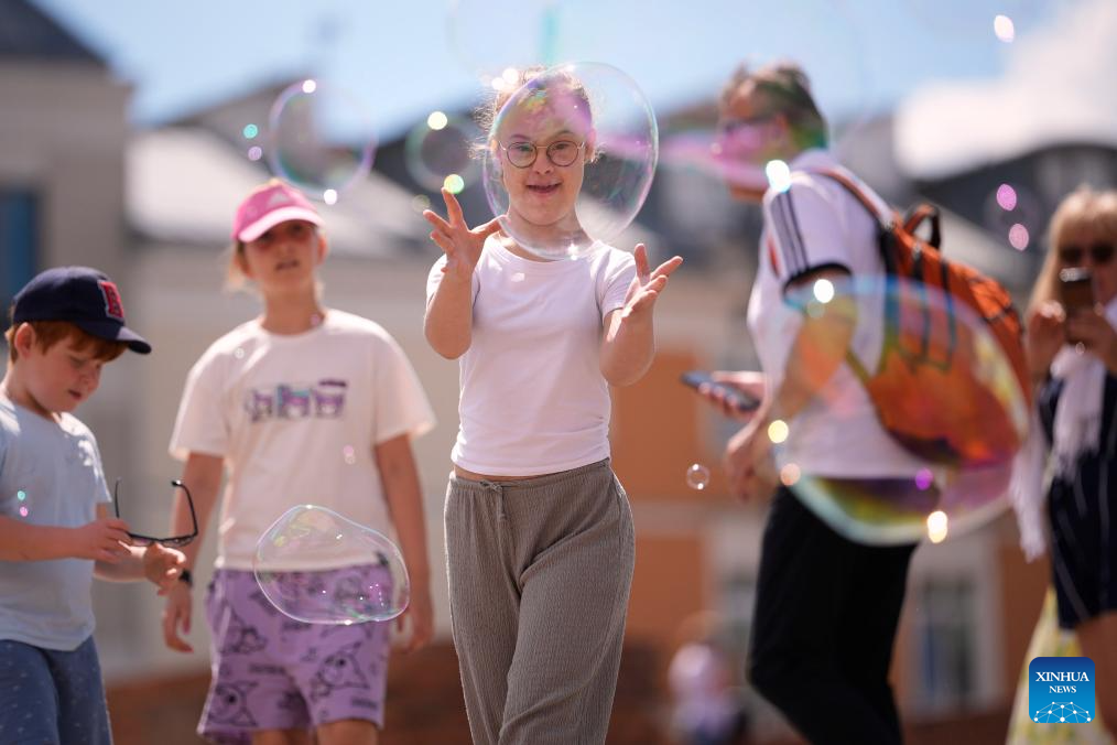 Children play with floating soap bubbles at the Royal Castle Square in Warsaw, Poland, on July 1, 2025. Poland's meteorological authorities have issued heat warnings for much of the country this week. (Photo by Jaap Arriens/Xinhua)