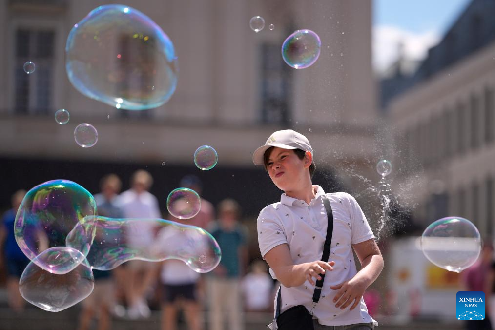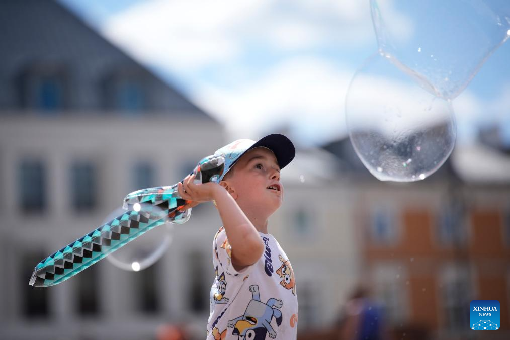 A child plays with floating soap bubbles at the Royal Castle Square in Warsaw, Poland, on July 1, 2025. Poland's meteorological authorities have issued heat warnings for much of the country this week. (Photo by Jaap Arriens/Xinhua)