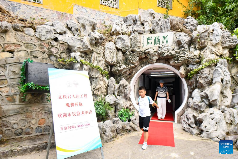 People walk out an air-raid shelter in Nanjing, east China's Jiangsu Province, July 2, 2025. Due to hot weather this summer, Nanjing has opened 22 air-raid shelters for free, providing local residents with various social and leisure services. (Photo by Yang Suping/Xinhua)