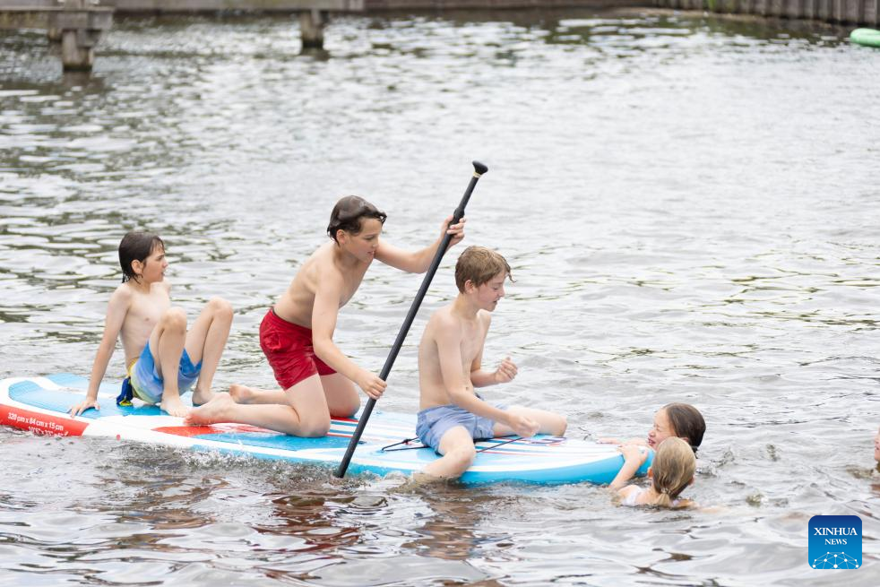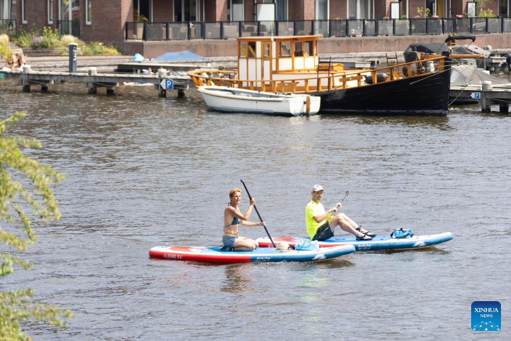 People row paddle boards across the Spaarne River during a heatwave in Haarlem, the Netherlands, on July 2, 2025. The Netherlands has been hit by its first official heat wave in three years, prompting the Royal Netherlands Meteorological Institute (KNMI) to issue an orange code alert for extreme heat in the country's southeastern region. (Photo by Sylvia Lederer/Xinhua)