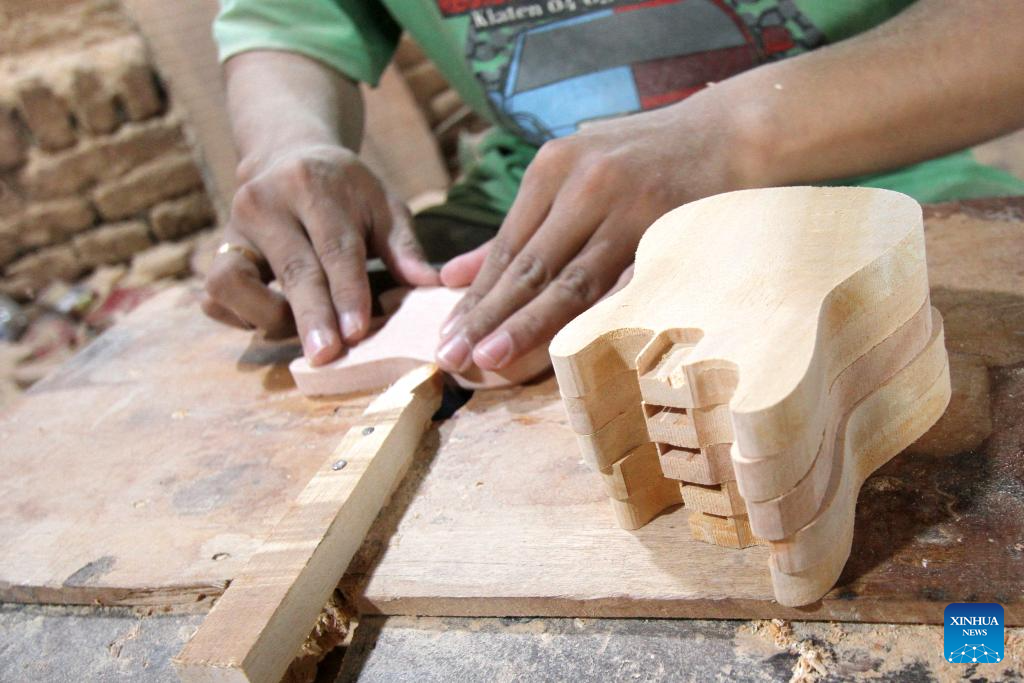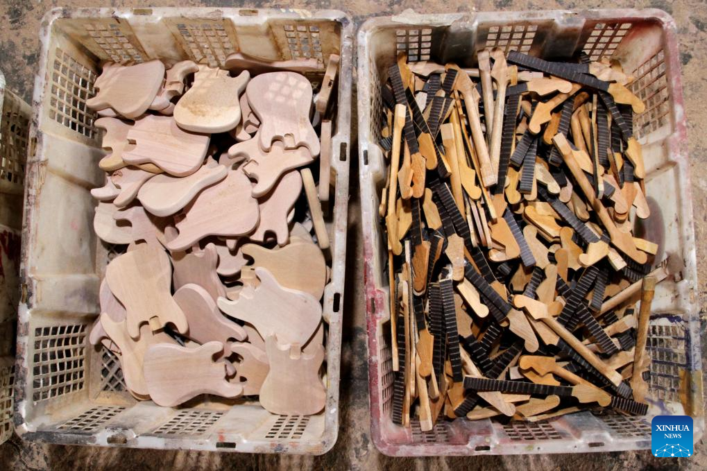 Parts of miniature guitars are seen at a handicraft workshop in Klaten Regency, Central Java, Indonesia, on July 3, 2025. Those miniature guitars are made from mahogany, aluminum, fiber, resin and strings. (Photo by Bram Selo/Xinhua)