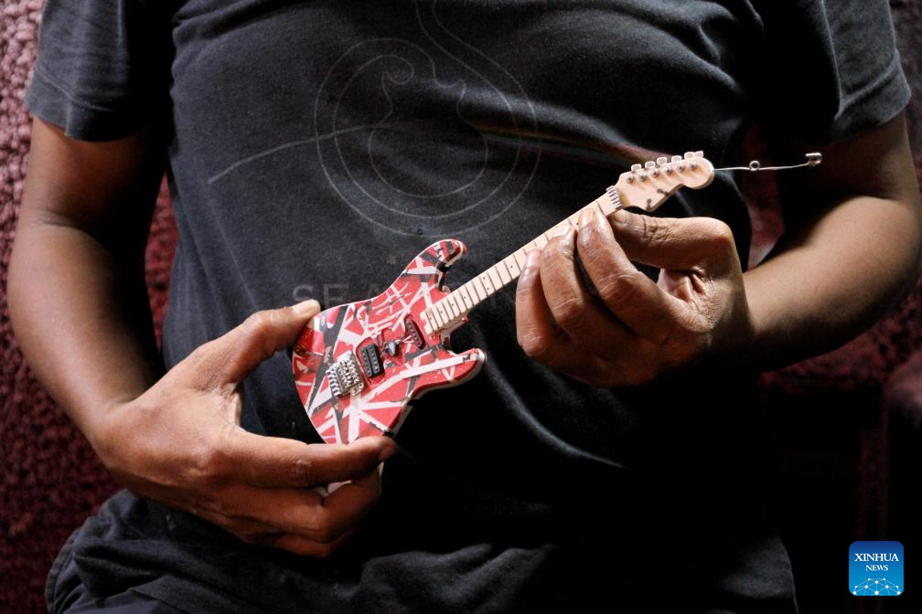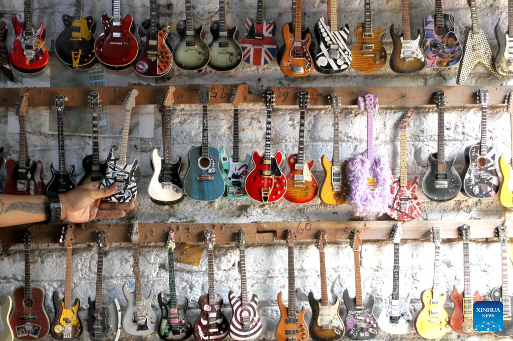 Miniature guitar collections are seen at a handicraft workshop in Klaten Regency, Central Java, Indonesia, on July 3, 2025. Those miniature guitars are made from mahogany, aluminum, fiber, resin and strings. (Photo by Bram Selo/Xinhua)