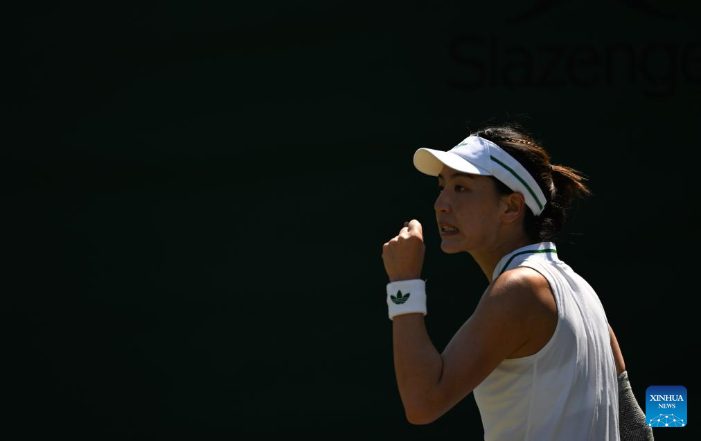 Wang Xinyu reacts during the women's singles second round match between Wang Xinyu of China and Zeynep Sonmez of Türkiye at the Wimbledon Tennis Championships in London, Britain, July 3, 2025. (Xinhua/Li Ying)