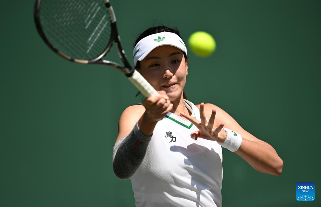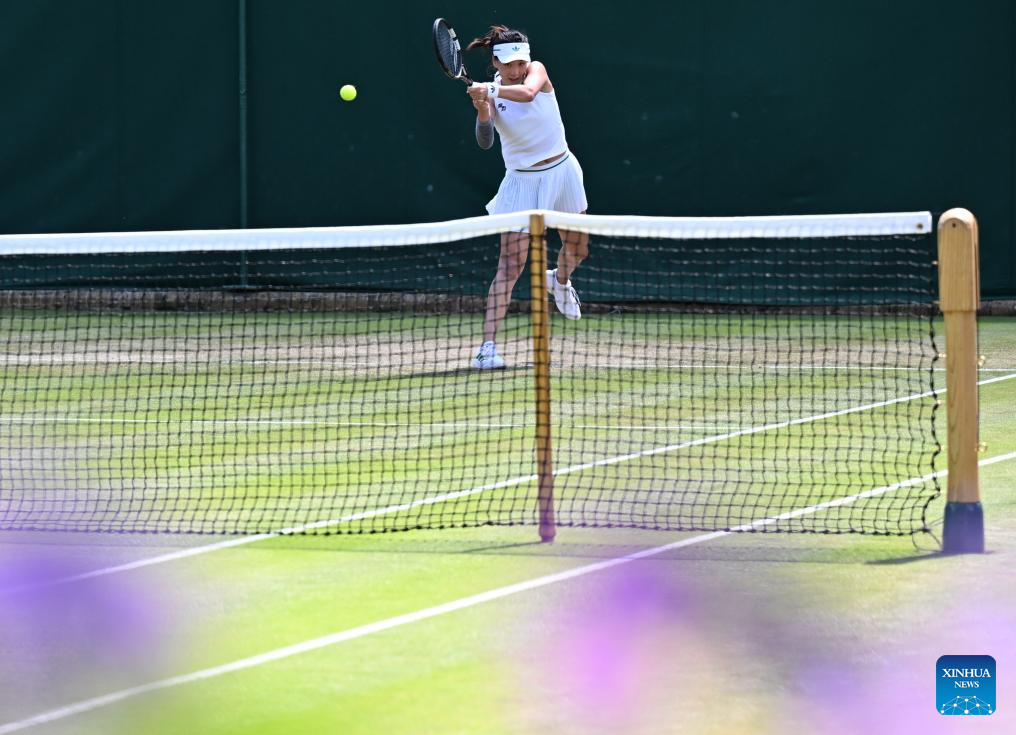 Wang Xinyu hits a return during the women's singles second round match between Wang Xinyu of China and Zeynep Sonmez of Türkiye at the Wimbledon Tennis Championships in London, Britain, July 3, 2025. (Xinhua/Zhao Dingzhe)