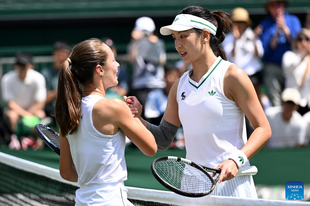 Wang Xinyu (R) greets Zeynep Sonmez after the women's singles second round match between Wang Xinyu of China and Zeynep Sonmez of Türkiye at the Wimbledon Tennis Championships in London, Britain, July 3, 2025. (Xinhua/Zhao Dingzhe)
