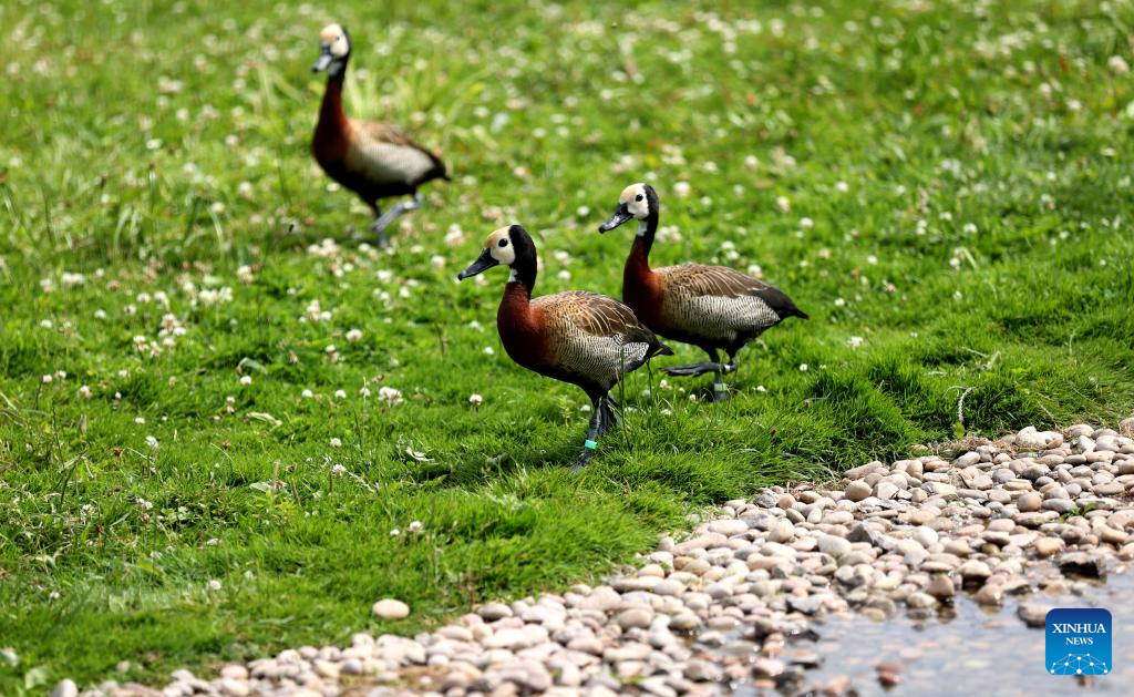 This photo taken on June 20, 2025 shows white faced whistling ducks at London Wetland Centre in London, Britain. As an important part of the world's ecosystem, wetland plays a huge role in many aspects including ecology, environment, economy and society.