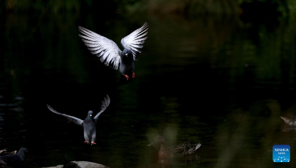 Pigeons fly at London Wetland Centre in London, Britain, June 20, 2025. As an important part of the world's ecosystem, wetland plays a huge role in many aspects including ecology, environment, economy and society. (Xinhua/Li Ying)