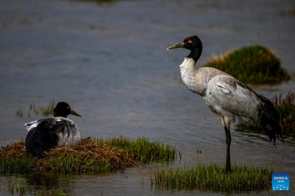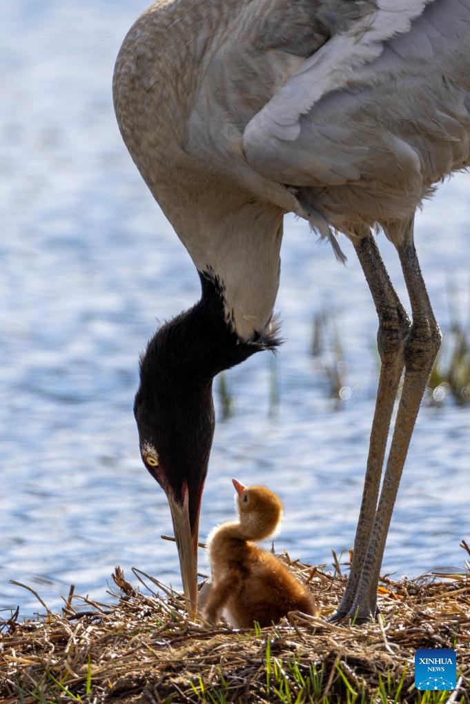A black-necked crane takes care of its baby at a wetland in Xainza County of Nagqu City, southwest China's Xizang Autonomous Region, June 5, 2025. As an important part of the world's ecosystem, wetland plays a huge role in many aspects including ecology, environment, economy and society. (Xinhua/Tenzing Nima Qadhup)