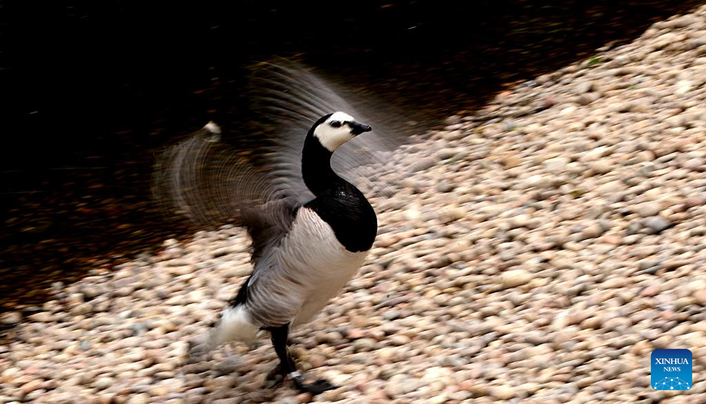 A barnacle goose shakes wings at London Wetland Centre in London, Britain, June 20, 2025. As an important part of the world's ecosystem, wetland plays a huge role in many aspects including ecology, environment, economy and society. (Xinhua/Li Ying)
