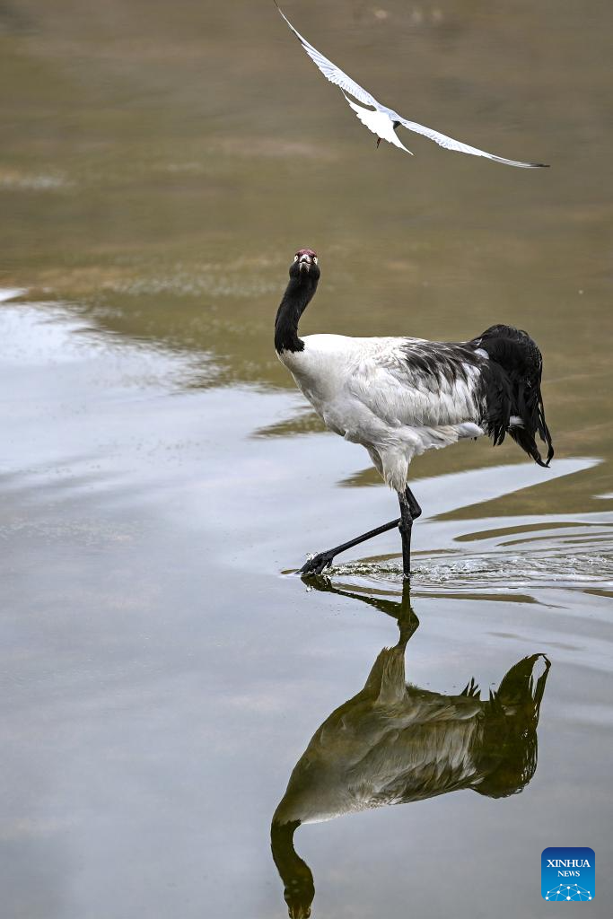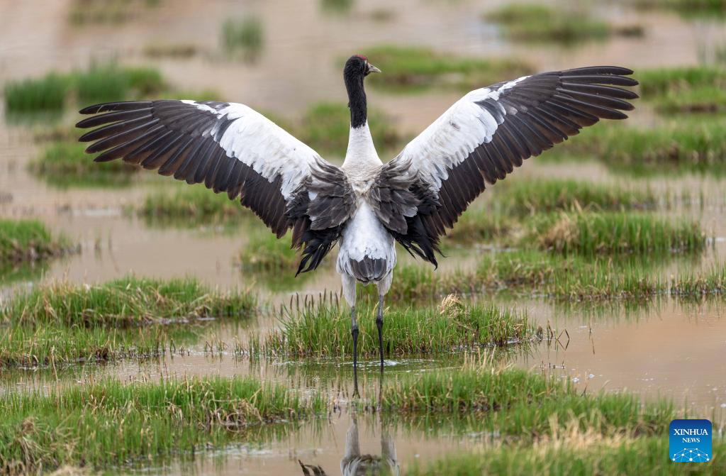 A black-necked crane is seen at a wetland in Xainza County of Nagqu City, southwest China's Xizang Autonomous Region, June 4, 2025. As an important part of the world's ecosystem, wetland plays a huge role in many aspects including ecology, environment, economy and society. (Xinhua/Tenzing Nima Qadhup)