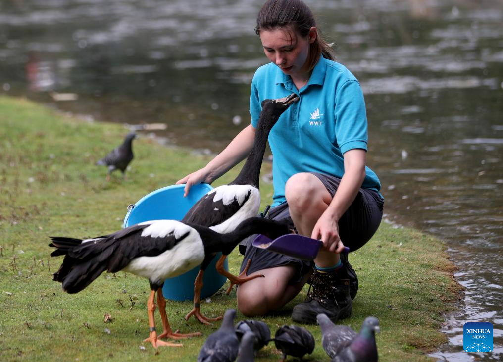 A staff member feeds magpie geese at London Wetland Centre in London, Britain, June 20, 2025. As an important part of the world's ecosystem, wetland plays a huge role in many aspects including ecology, environment, economy and society. (Xinhua/Li Ying)
