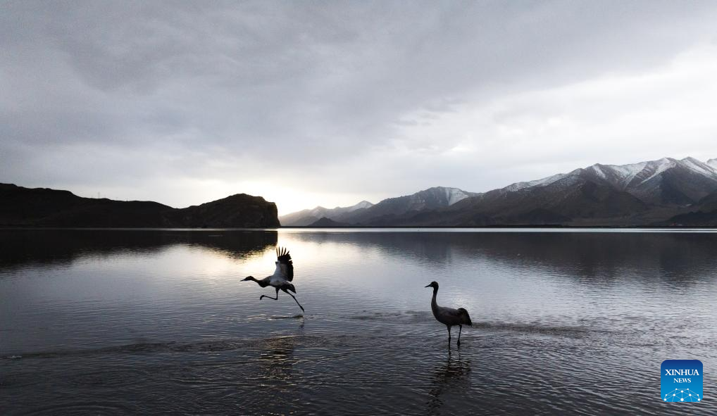 Black-necked cranes are seen at a reservoir in Lhunzhub County of Lhasa, southwest China's Xizang Autonomous Region, March 8, 2025. As an important part of the world's ecosystem, wetland plays a huge role in many aspects including ecology, environment, economy and society. (Xinhua/Tenzin Nyida)