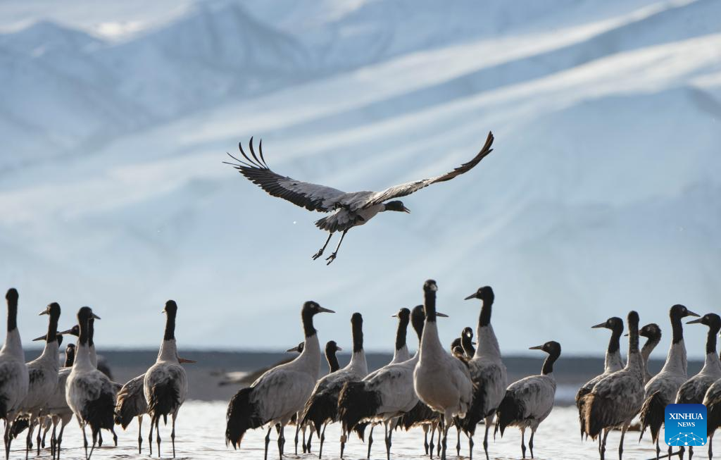 Black-necked cranes are seen at a reservoir in Lhunzhub County of Lhasa, southwest China's Xizang Autonomous Region, Feb. 20, 2025. As an important part of the world's ecosystem, wetland plays a huge role in many aspects including ecology, environment, economy and society. (Xinhua/Jigme Dorje)