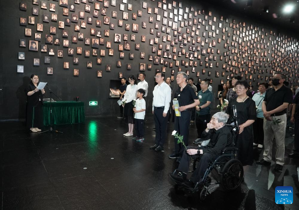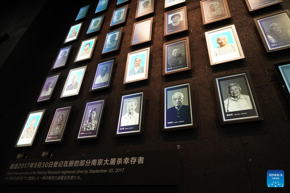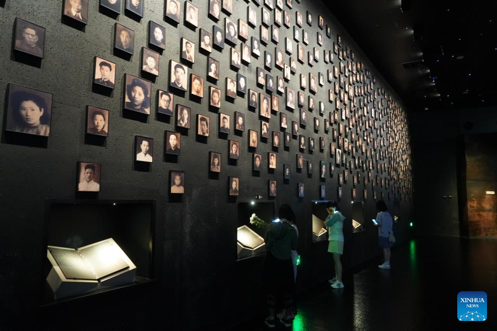 People visit the Memorial Hall of the Victims in Nanjing Massacre by Japanese Invaders in Nanjing, east China's Jiangsu Province, July 2, 2025. A "lights out" ceremony for two survivors of the Nanjing Massacre who passed away this year was held here on Wednesday. On a photo wall featuring survivors of the Nanjing Massacre, the lightboxes of Liu Guixiang and Xie Guiying were dimmed off, and their colored photos then turned to black and white.