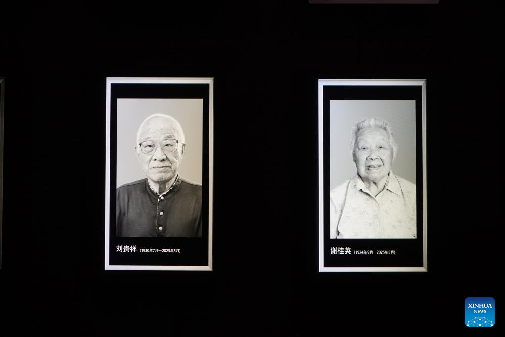 This photo taken on July 2, 2025 shows the lightboxes of Liu Guixiang (2nd R, bottom) and Xie Guiying (1st R, bottom) on a photo wall featuring survivors of the Nanjing Massacre at the Memorial Hall of the Victims in Nanjing Massacre by Japanese Invaders in Nanjing, east China's Jiangsu Province. A "lights out" ceremony for two survivors of the Nanjing Massacre who passed away this year was held here on Wednesday. On a photo wall featuring survivors of the Nanjing Massacre, the lightboxes of Liu Guixiang and Xie Guiying were dimmed off, and their colored photos then turned to black and white.