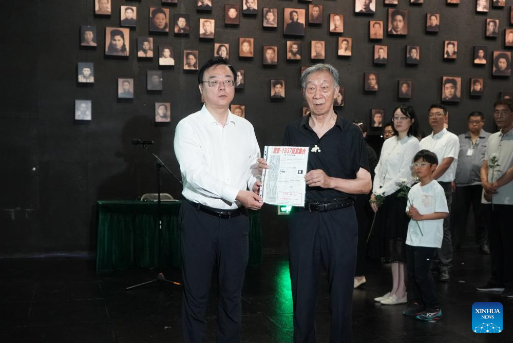 Jiang Zhongrong (R), son of the Nanjing Massacre survivor Xie Guiying, donates an item belonging to Xie to the Memorial Hall of the Victims in Nanjing Massacre by Japanese Invaders in Nanjing, east China's Jiangsu Province, July 2, 2025. A "lights out" ceremony for two survivors of the Nanjing Massacre who passed away this year was held here on Wednesday. On a photo wall featuring survivors of the Nanjing Massacre, the lightboxes of Liu Guixiang and Xie Guiying were dimmed off, and their colored photos then turned to black and white.