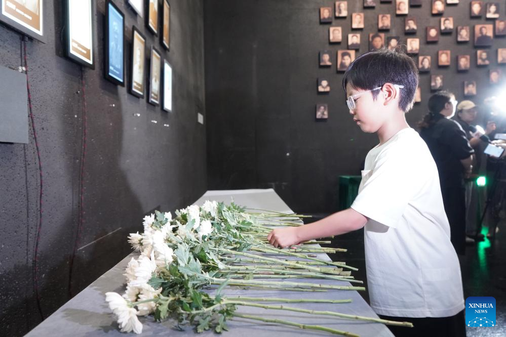 Sun Guoting, descendant of the Nanjing Massacre survivor Liu Guixiang, lays a flower during a "lights out" ceremony held at the Memorial Hall of the Victims in Nanjing Massacre by Japanese Invaders in Nanjing, east China's Jiangsu Province, July 2, 2025. A "lights out" ceremony for two survivors of the Nanjing Massacre who passed away this year was held here on Wednesday. On a photo wall featuring survivors of the Nanjing Massacre, the lightboxes of Liu Guixiang and Xie Guiying were dimmed off, and their colored photos then turned to black and white.